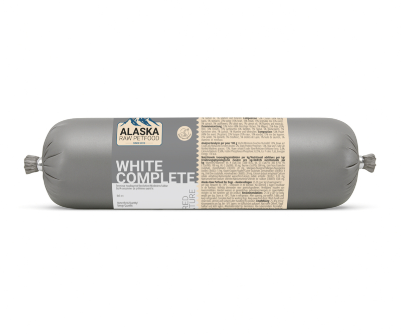 Alaska complete white, een variant van verschillende wit vlees diersoorten. De aanvulling met zalmolie, vitamines en mineralen zorgen voor een compleet product waarin alle benodigde voedingsstoffen aanwezig zijn die jouw hond nodig heeft.